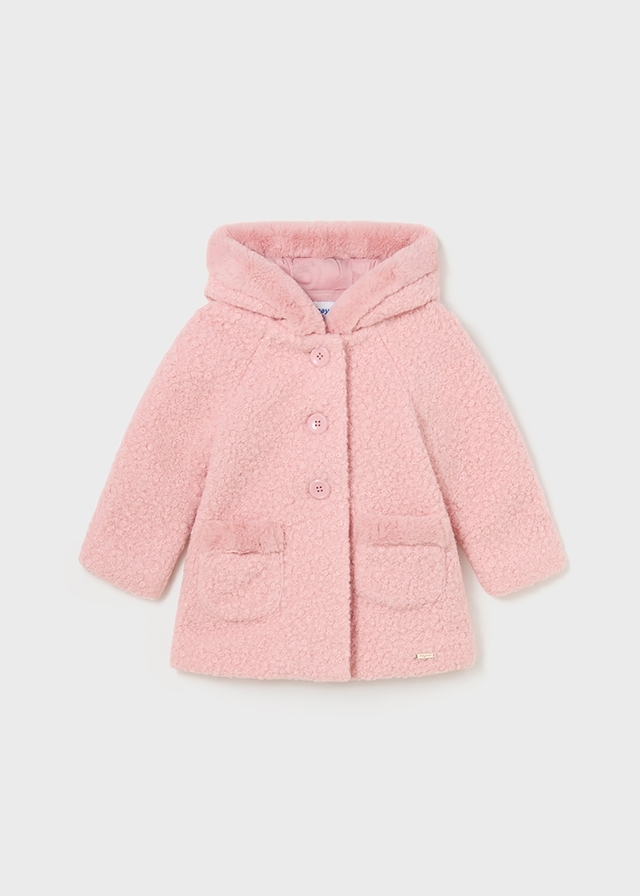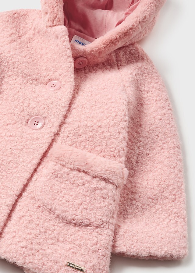 Безумно красивое и элегантноепальто с капюшоном для девочекрозового цвета. Ваша дочкабудет в нем как маленькая леди.Декорированные мехом кармашкии капюшон смотрятся оченьстильно и эффектно.