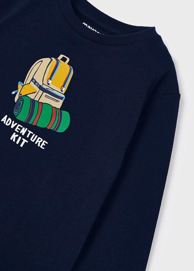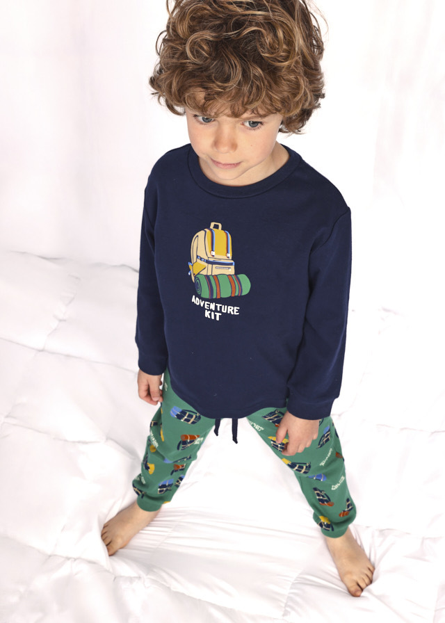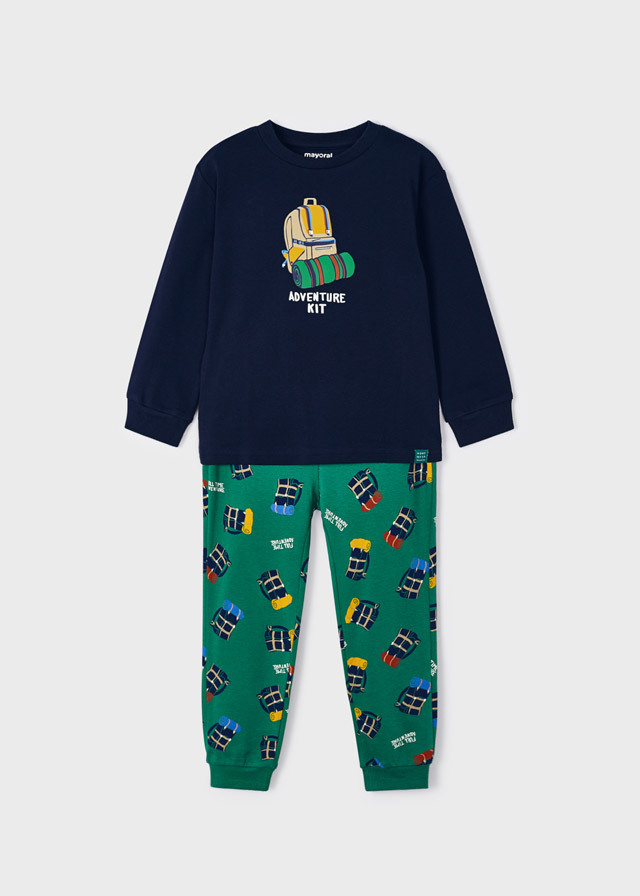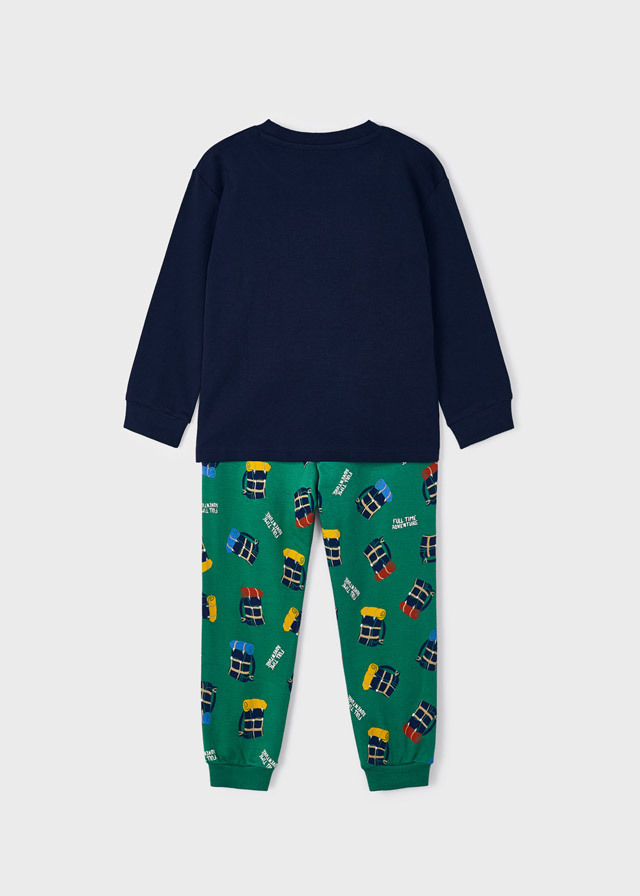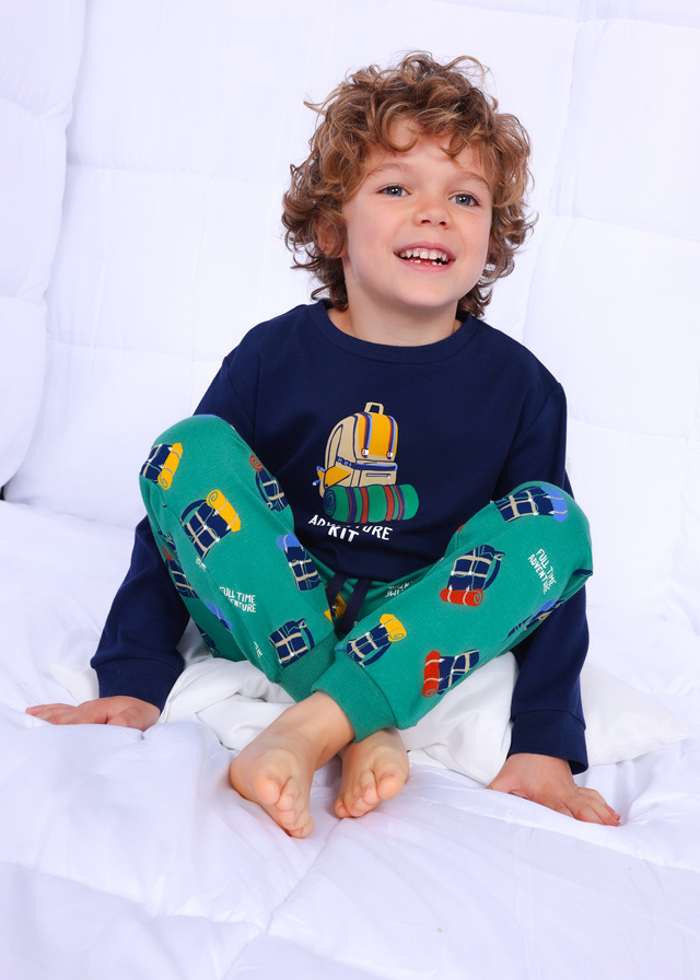 Трикотажный домашний костюмиз штанишек зеленого цвета икофточкой темно-синего оттенкас рисунками походных рюкзаковточно понравится каждому мальчишке.