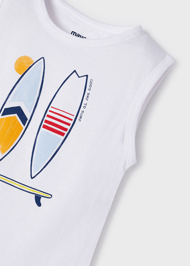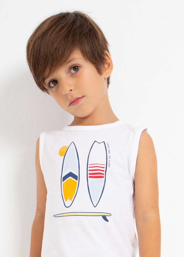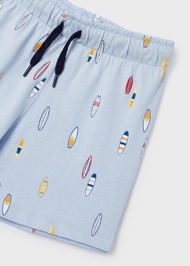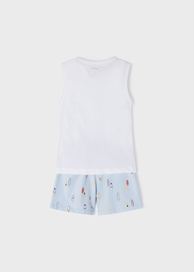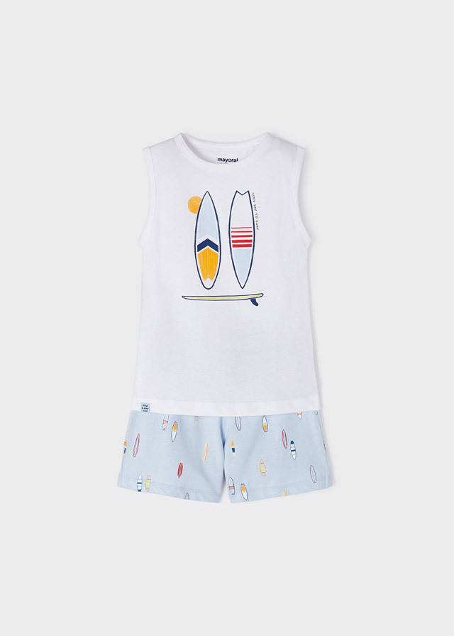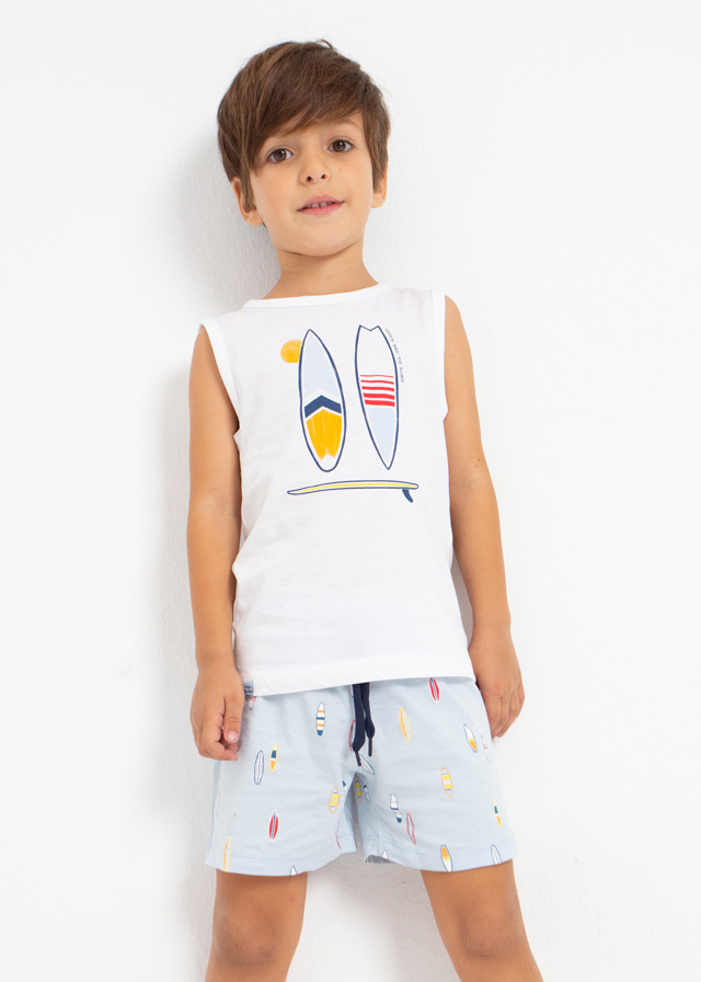 Трикотажный домашний костюмиз голубых шортиков на завязкахи майкой с рисунками досок длясерфинга очень приятный и мягкий.Он подарит чувство уюта Вашемуребенку. Прекрасно подойдетдля сна в качестве пижамы.