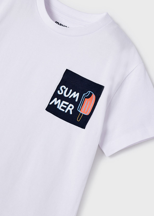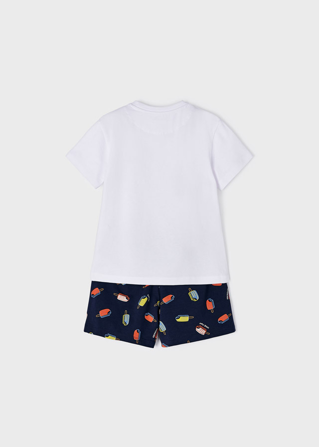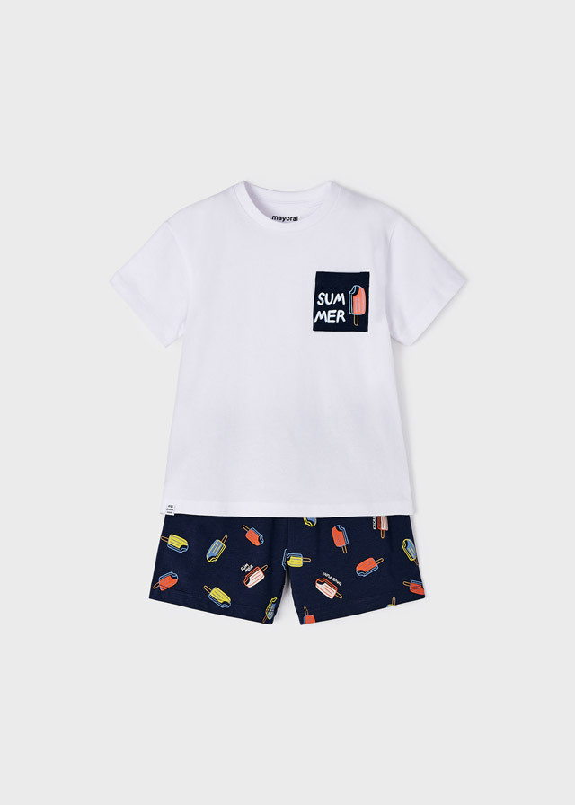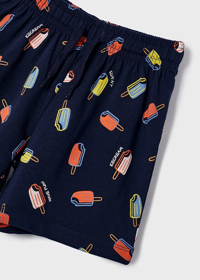Трикотажный домашний костюмиз шортиков на завязках с рисункоммороженого с белой футболкойочень приятный и мягкий. Онподарит чувство уюта Вашемуребенку. Прекрасно подойдетдля сна в качестве пижамы.