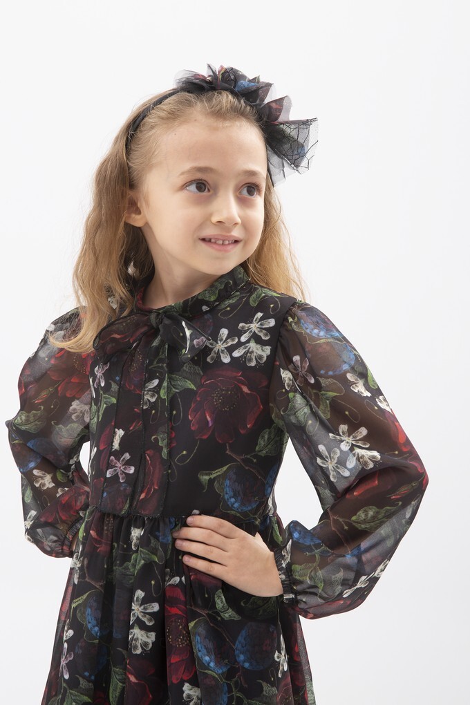 Стильное шифоновое платье свободногокроя черного цвета с рисункомцветов и слив произведет фурор.Бант на воротничке и ободок на головуделает образ особенным. У платья естьподкладка из 100% хлопка.