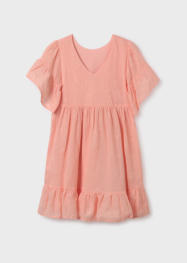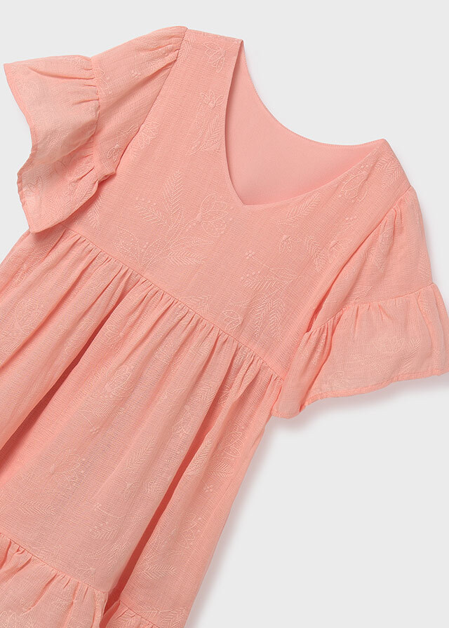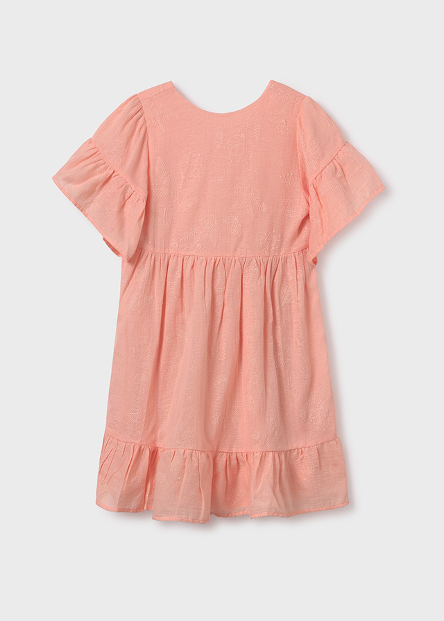 Кораллового цвета воздушное платьес объемными рукавами и такого жеоттенка узорами будет смотретьсяочень мило и свежо на каждойдевочке. Идеальный вариант на лето.