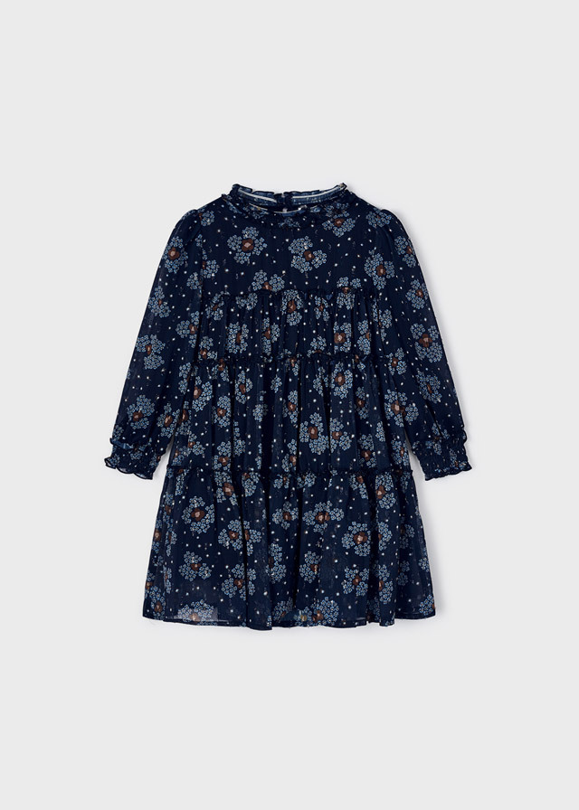 Воздушное шифоновое платьетемно-синего цвета с рисункомшикарных бутонов идеальноподойдет на осень. Образ можнозавершить плотными колготкамии ботинками.
