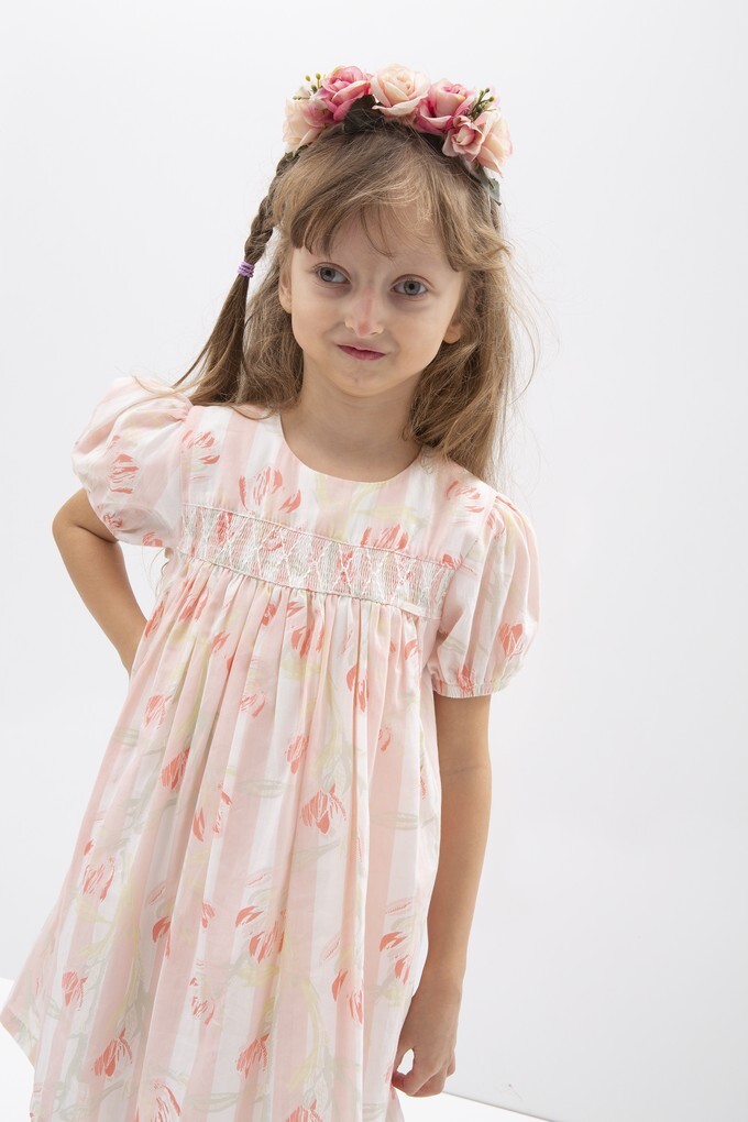 Милейшее нежное платье с рисункомтюльпанов с рукавами-фонарикамивыделит Вашу доченьку на фонеостальных девчонок. У платья естьподкладка из 100% хлопка.