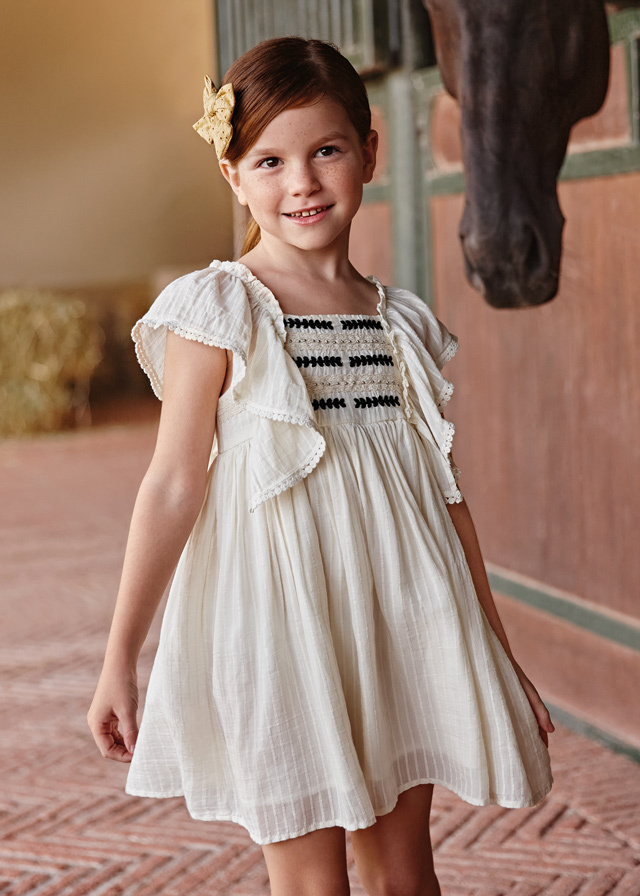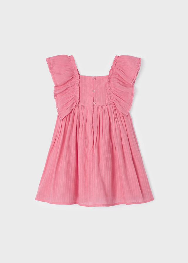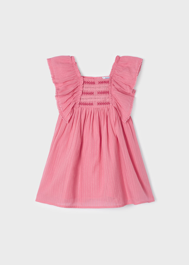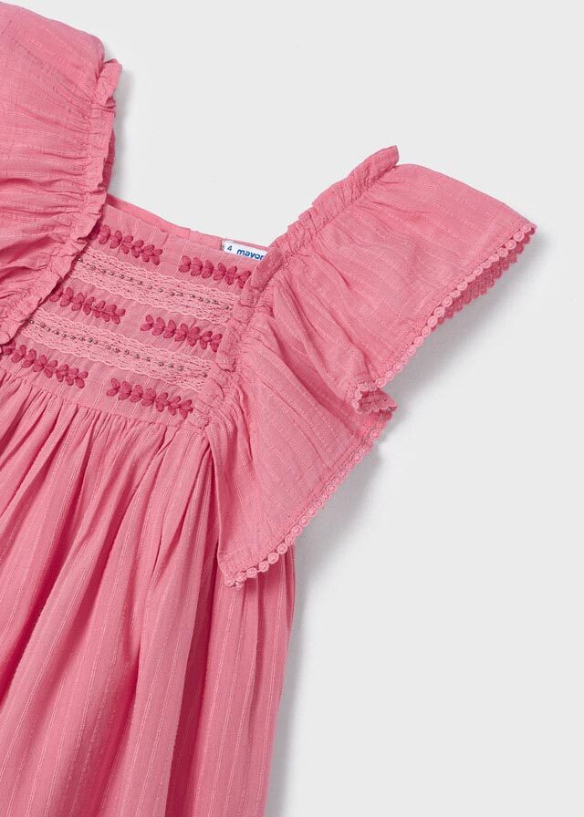 Нежно-розовое воздушное платьес объемными бретельками ивышивкой на груди выделитВашу дочку этим летом. Приятнаяи нежная ткань подарит чувствоуюта. Подкладка выполненаиз 100% хлопка.