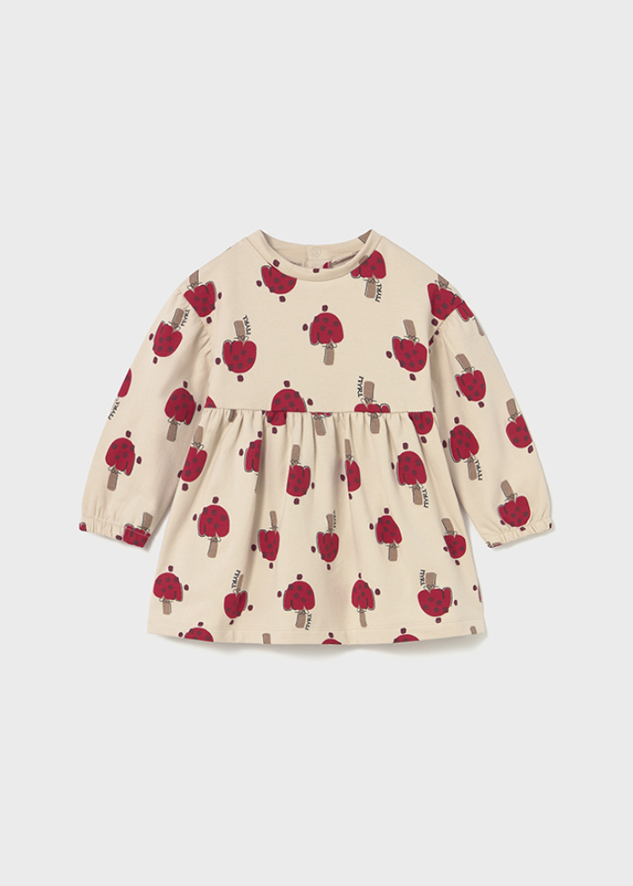 Милое трикотажное платье с длиннымрукавом необычного фасона.Красивая расцветка и приятная тканьне оставят малышку равнодушной.