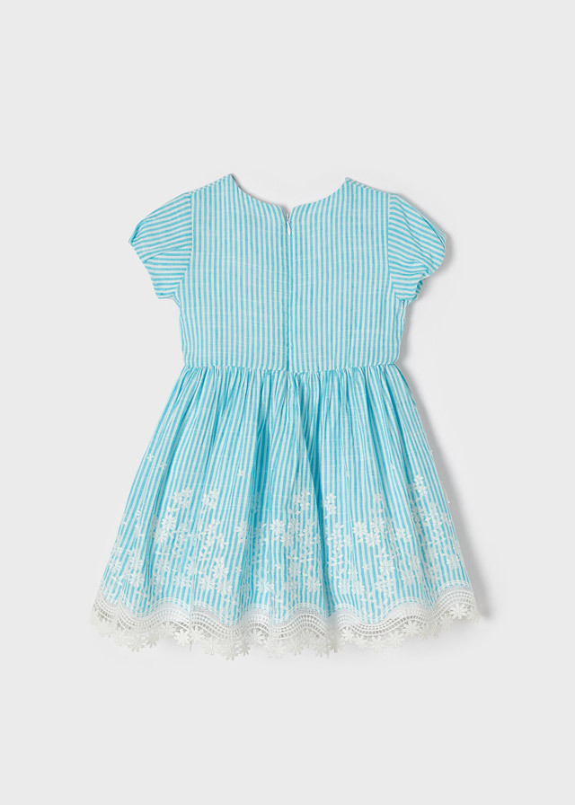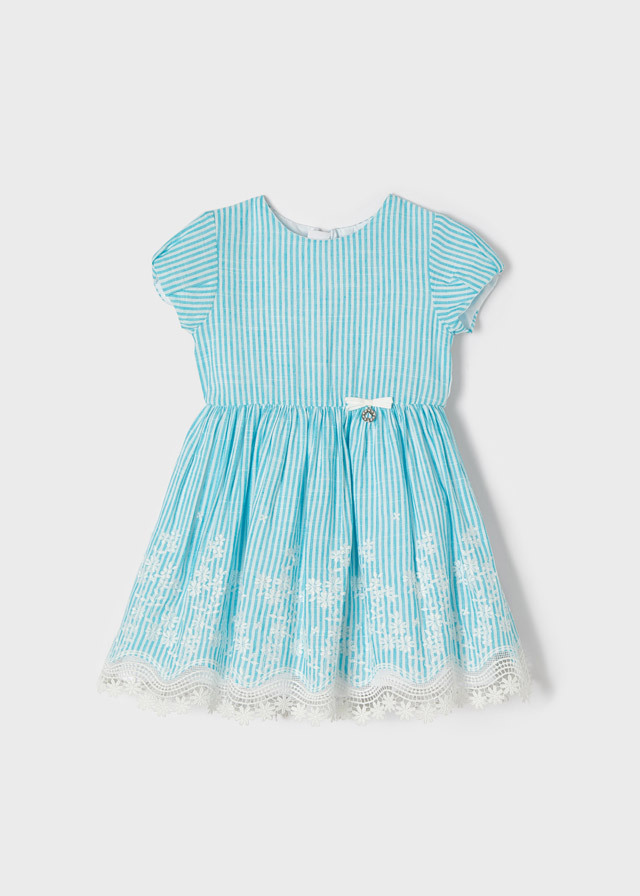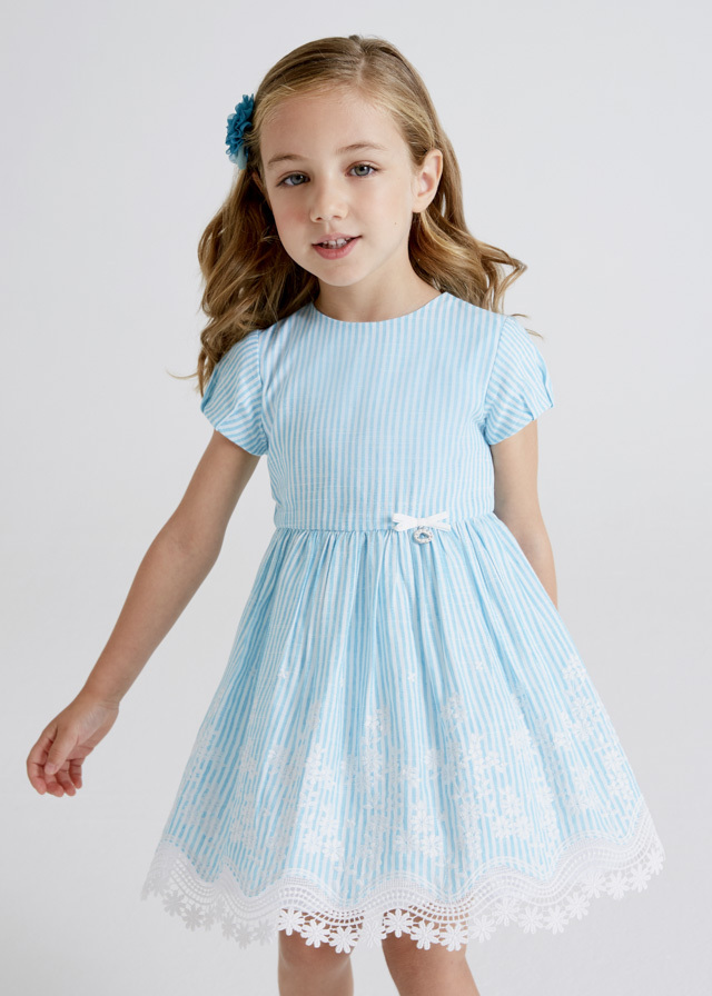 Легкое летнее платье небесного цветав полоску с белыми цветочкамина нижней части и белыми кружевамиотлично подойдет для мероприятия втеплое время года.