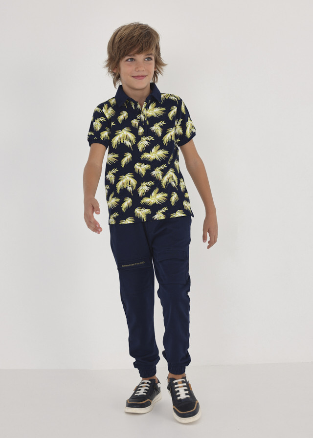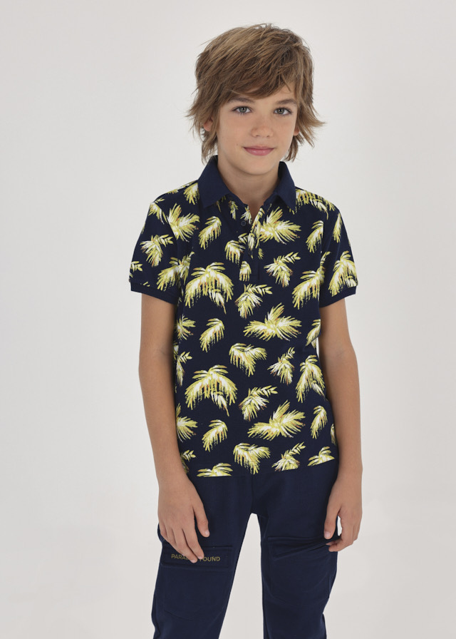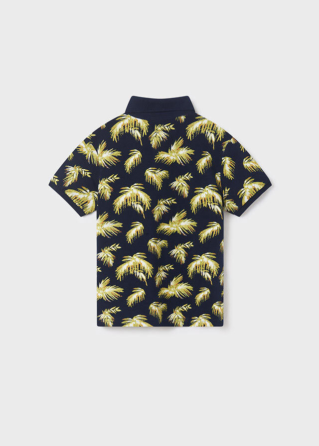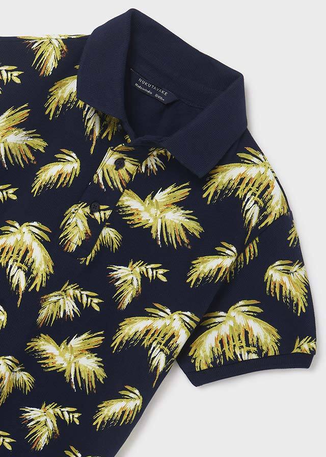 Очень комфортное поло темно-синегоцвета с рисунком золотых пальмовыхветвей станет отличной базовой вещьюв гардеробе Вашего мальчика.