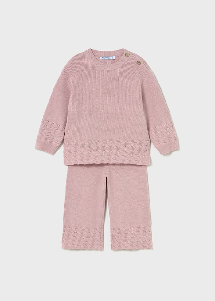 Трикотажный костюм с фактурнойотделкой для малышки очень милыйи мягкий. Костюм состоит из чудеснойкофты и комфортных брюк.