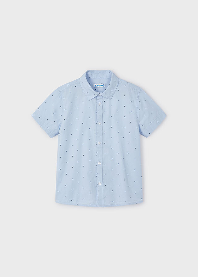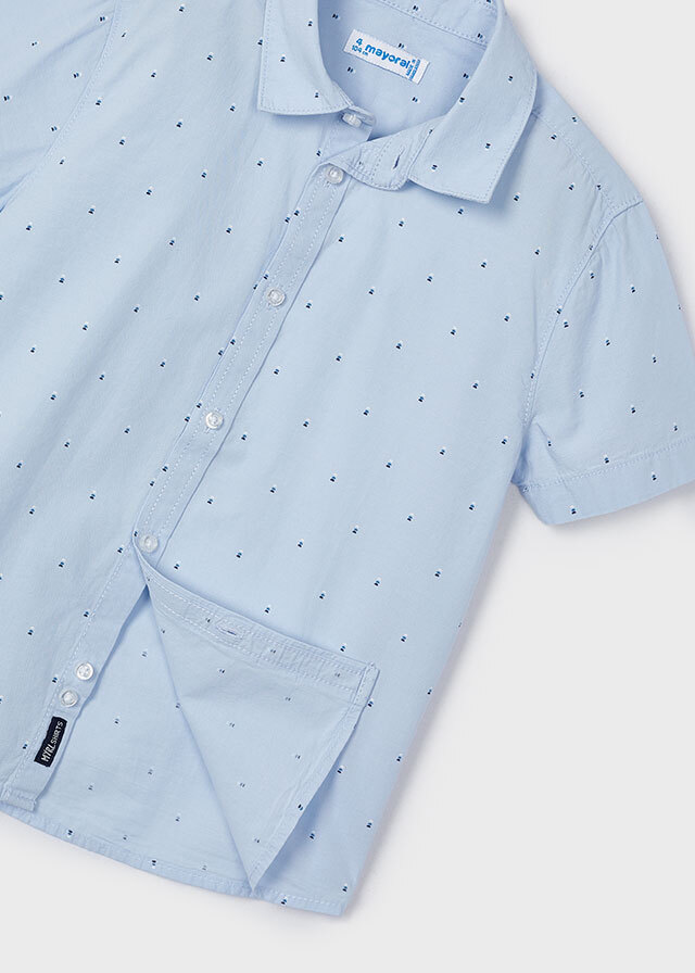 Легкая прямая голубая рубашка из хлопкас коротким рукавом в мелкий орнаментвыручит Вас этим летом. Ее легко сочетатькак с джинсами, так и с шортами.