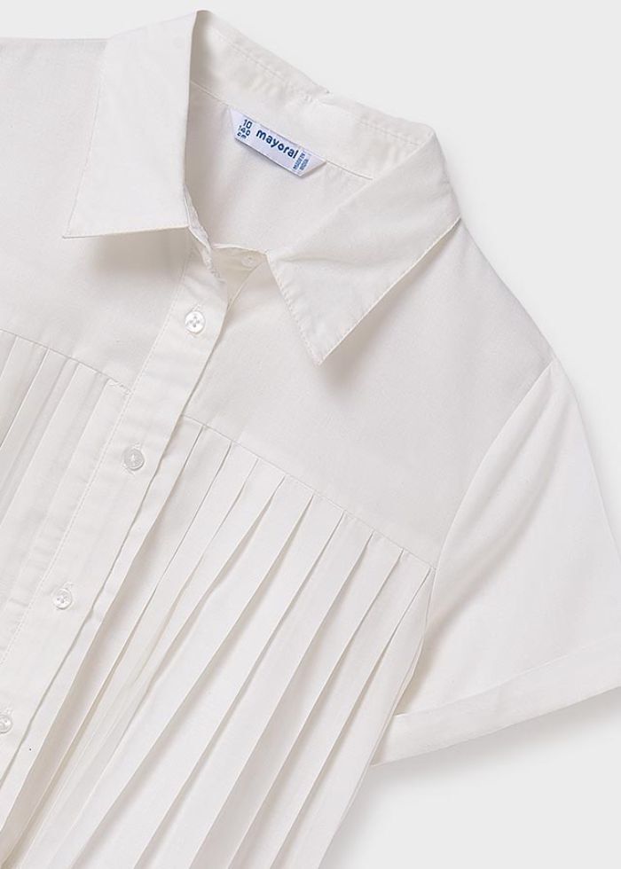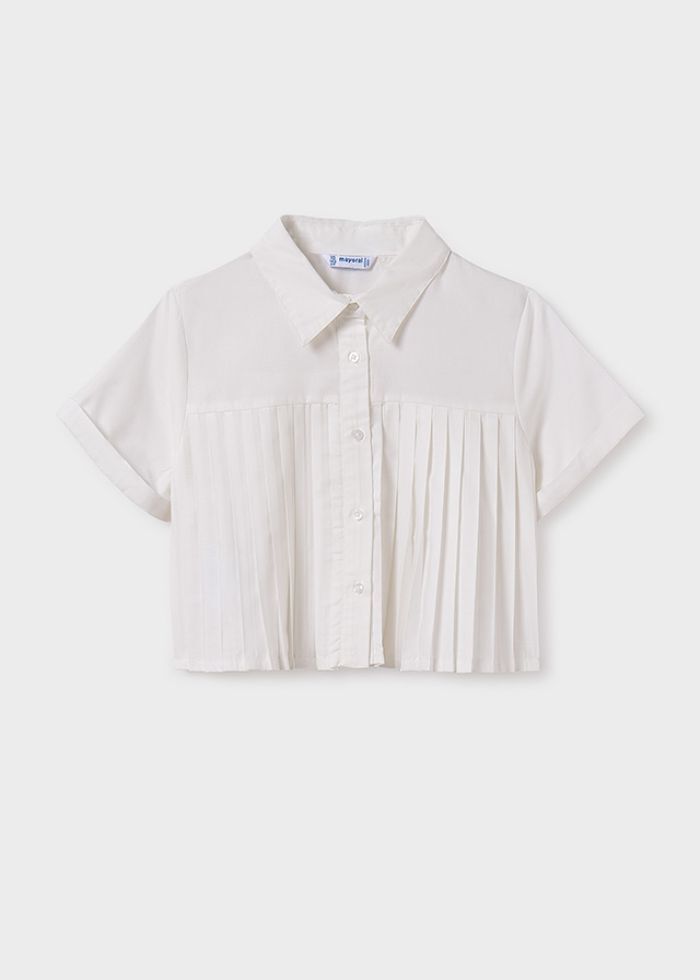 Укороченная широкая рубашка сдрапировкой - это идеальный вариантдля летних прогулок. Будет стильносмотреться с шортиками и штанишками.Отлично подойдет и для школы в качествеблузки.