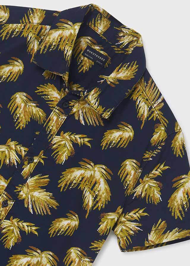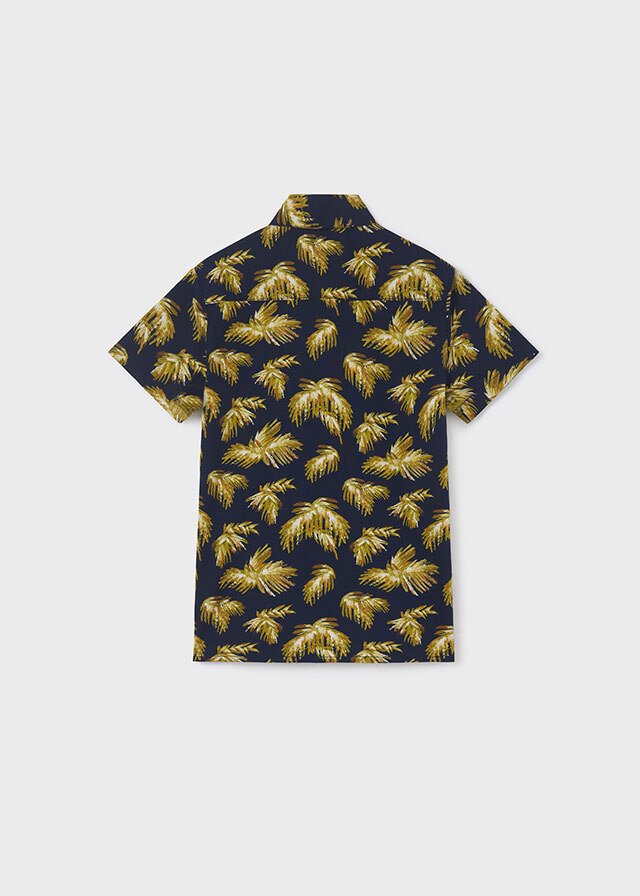Эффектная рубашка глубокогосинего цвета с рисунком пальмовыхветвей выделит мальчика на фонеостальных. Отличный вариантдля подарка сыну.