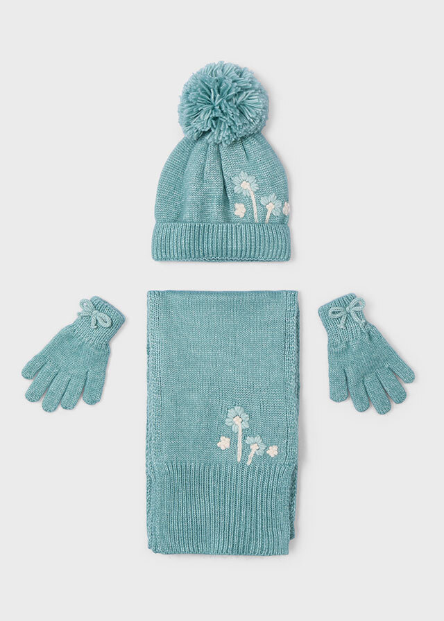 Очень нежный и мягкий комплект длядевочек из шапки с помпоном с длиннымшарфом и перчатками преобразит любуюверхнюю одежду.
