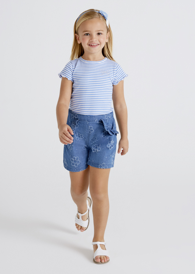 Мягкие джинсовые шортики синегоцвета с оборкой вдоль карманов ивышитыми цветочками сделаютобраз очень кокетливым.