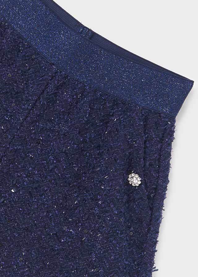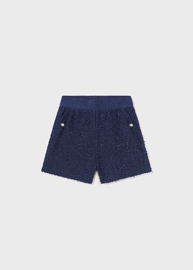 Элегантные твидовые шортыс люрексом глубокого синего цветастанут отличной альтернативойшкольной форме вместе с блузкой.Образ можно завершить плотнымиколготками и ботинками.