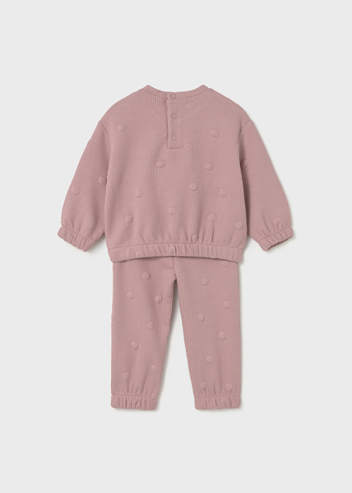 Спортивный костюм с фактурнойотделкой для малышки очень милыйи мягкий. Костюм состоит из чудеснойкофты и комфортных брюк.
