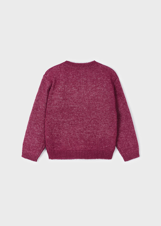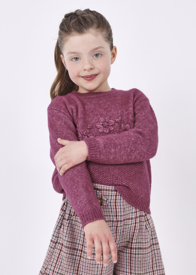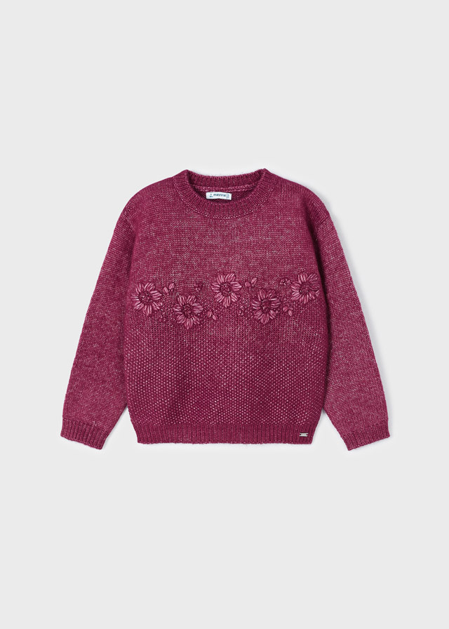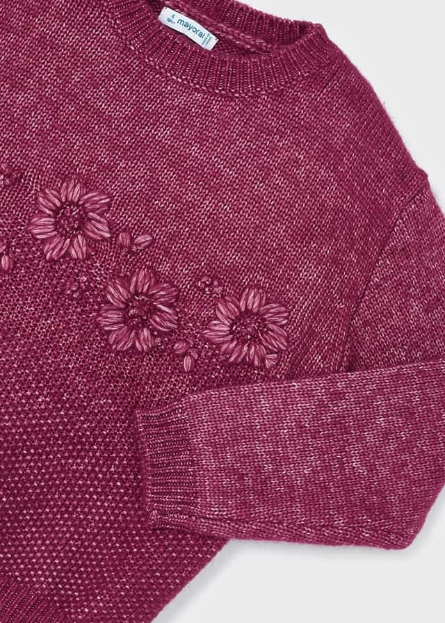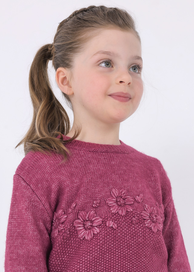Нежный и мягкий малинового цветавязаный свитер для девочки свышитыми цветочками не оставитВашу доченьку без внимания. Прекраснобудет смотреться даже с яркимиджинсами и с юбкой.
