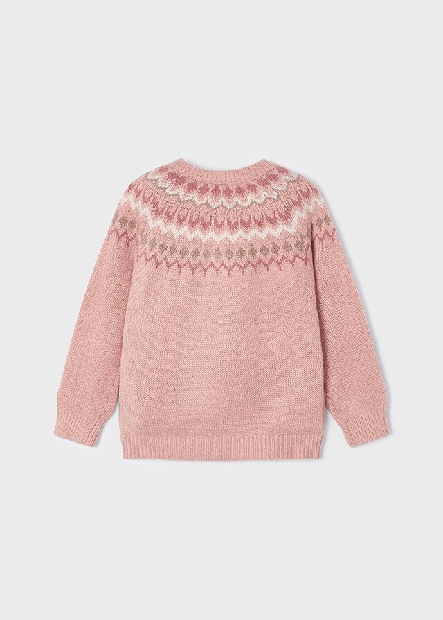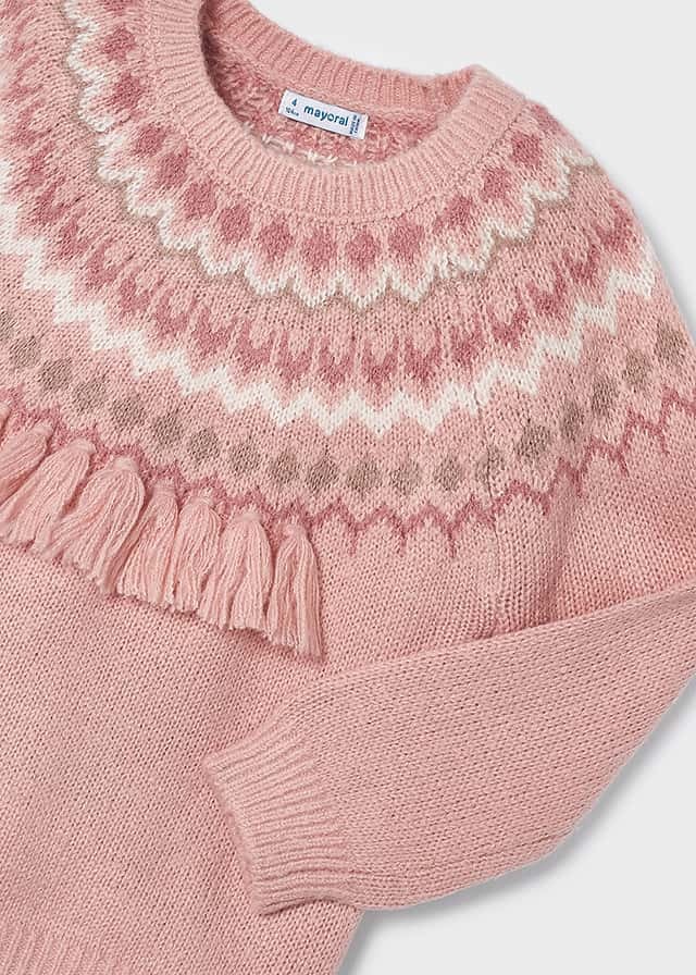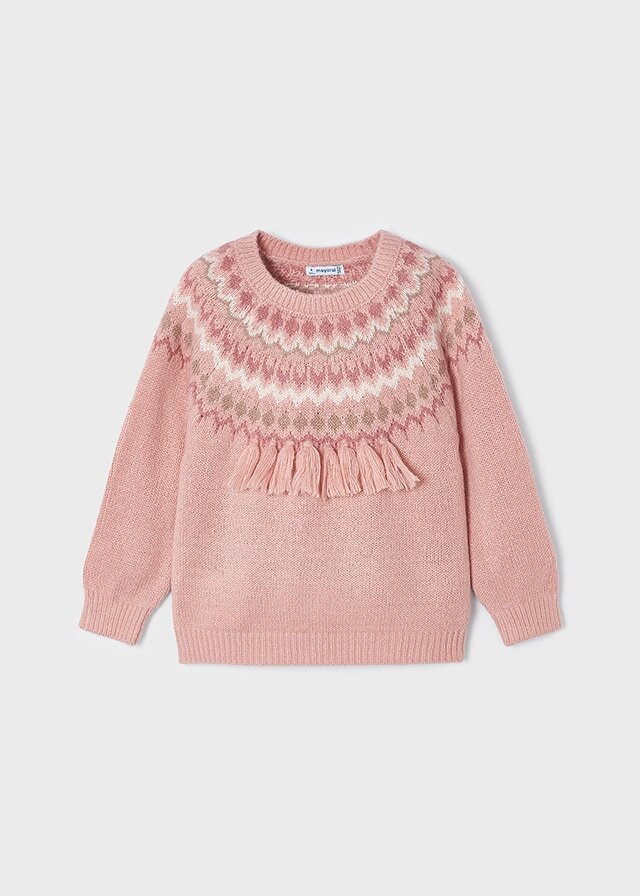 Милый и мягкий нежно-розовогоцвета свитер с узором в верхней частии с кисточками в качестве декоране оставит Вашу доченьку без внимания.Прекрасно будет смотреться с любымиштанишками или юбочкой.