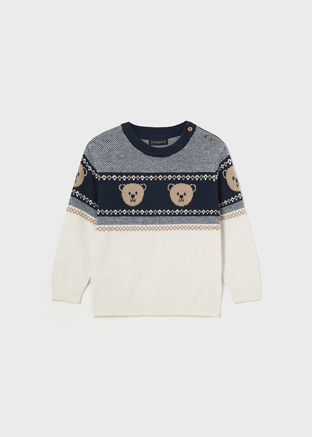 Очень нежный и приятный к телу свитерс очаровательным рисунком выделитВашего малыша на фоне остальных. Двепуговички на плече помогут мальчику без труданадевать кофту.