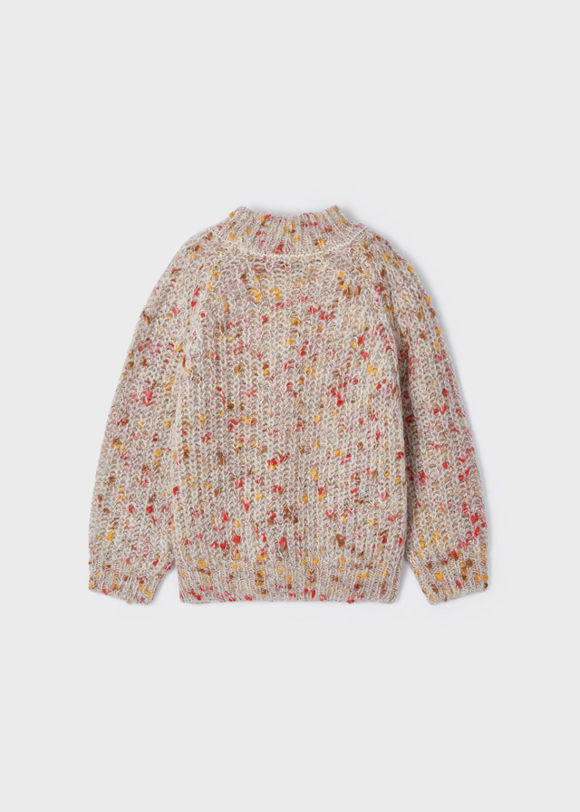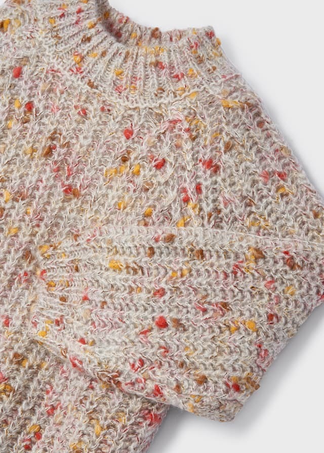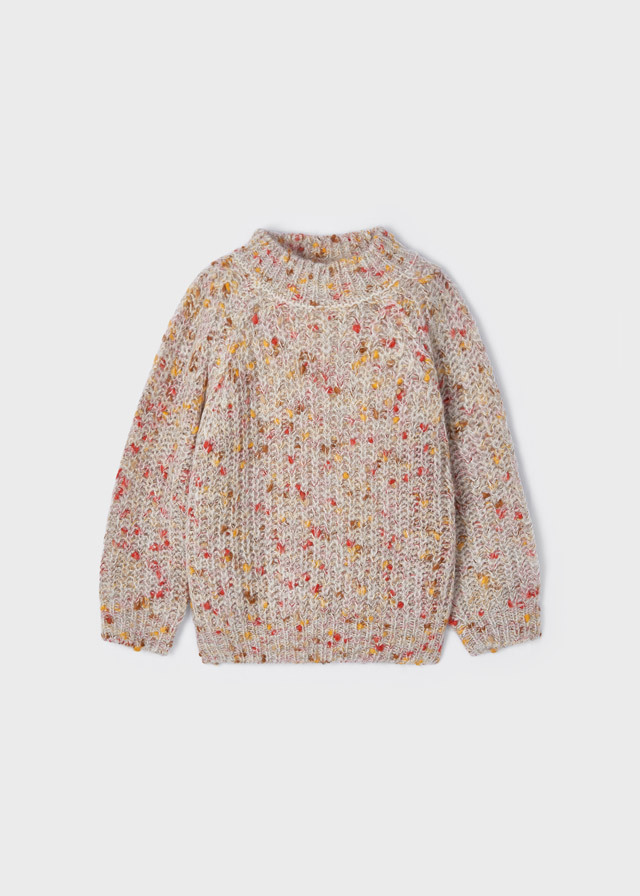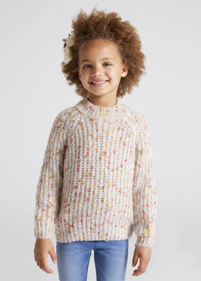 Мягкий бежевый свитер крупной вязкине оставит Вашу дочку равнодушной.Кофта согреет в прохладную погоду.А яркие разноцветные вкраплениясделают наряд еще и особенным.