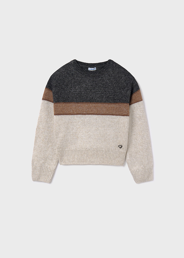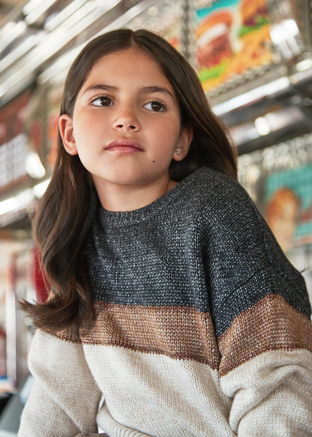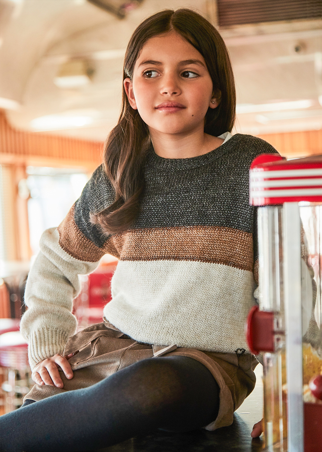 Нежный и мягкий вязаный свитерв полоску для девочки не оставитВашу дочку без внимания. Прекраснобудет смотреться даже с яркимиджинсами и с юбкой.