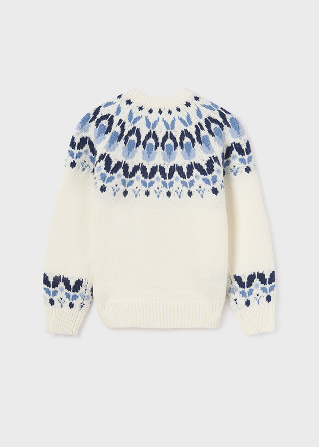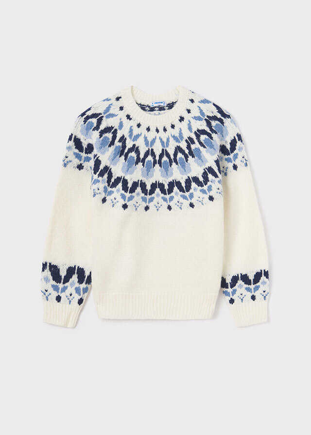 Милый и мягкий молочного цветасвитер с синим узором в верхней частине оставит Вашу дочку без внимания.Прекрасно будет смотреться с любымиштанами или даже поверх платья.