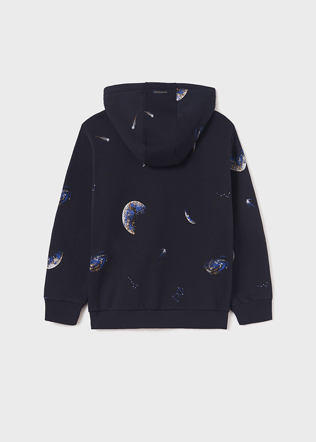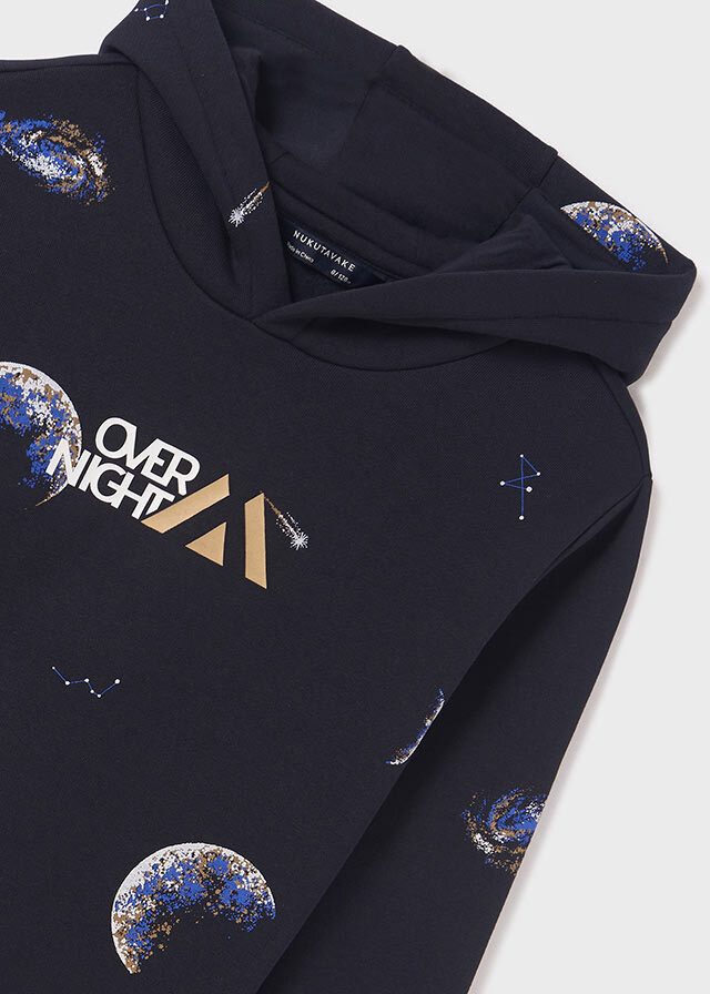 Удобная толстовка с капюшономглубокого синего цвета с рисункомпланет подойдет на осень и зиму.Ее можно носить не только сджинсами, но со спортивнымиштанами любого цвета.