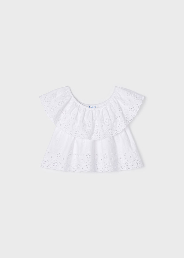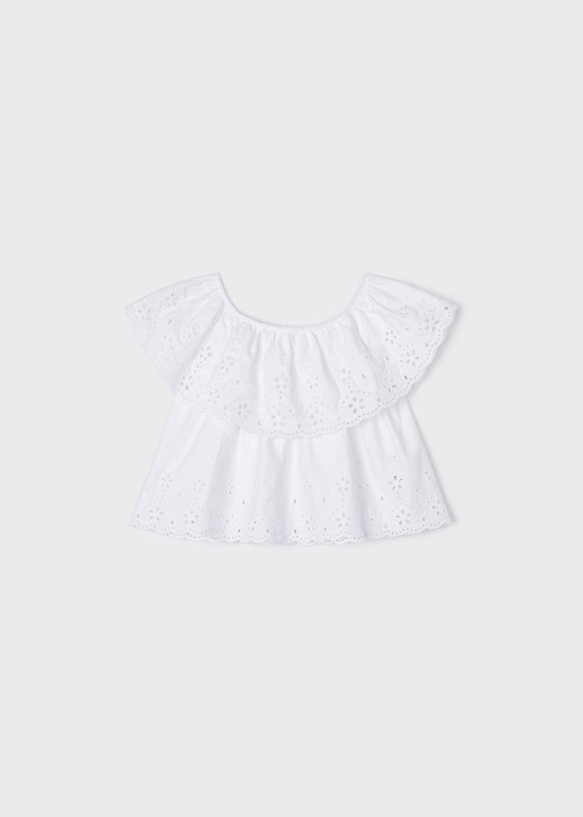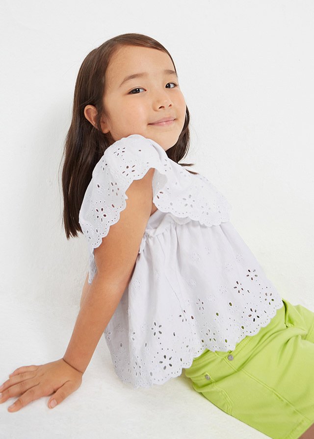 Белый воздушный топ с эффектомкружев сделает Вашу девочкусамой красивой среди подружек.Будет круто смотреться и с шортами,и с джинсами.