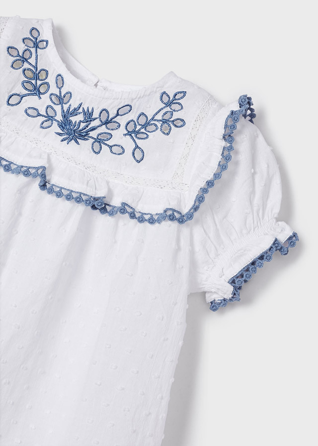 Фантастический воздушный топбелоснежного цвета с синимдекором создаст незабываемыйнаряд. Будет круто смотреться какс шортами, так и с брючками.