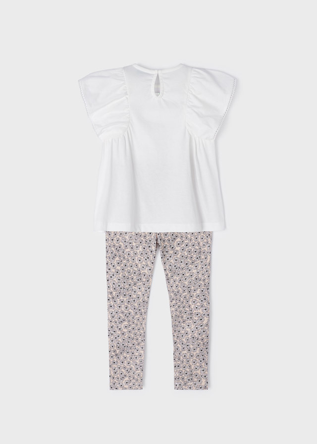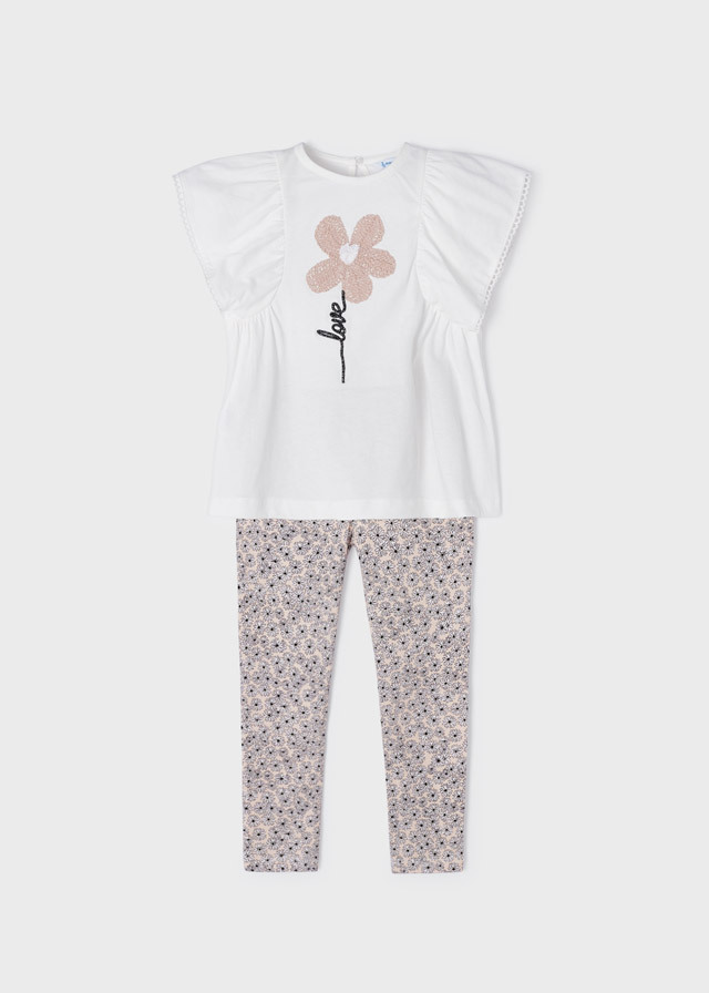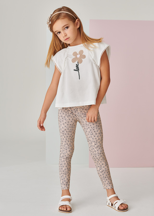 Воздушный белый топ с вышитойромашкой с пуговичкой сзадивместе с бежевыми леггинсами,усыпанными цветочками - этоидеальный вариант на лето.