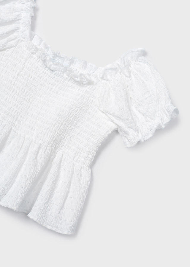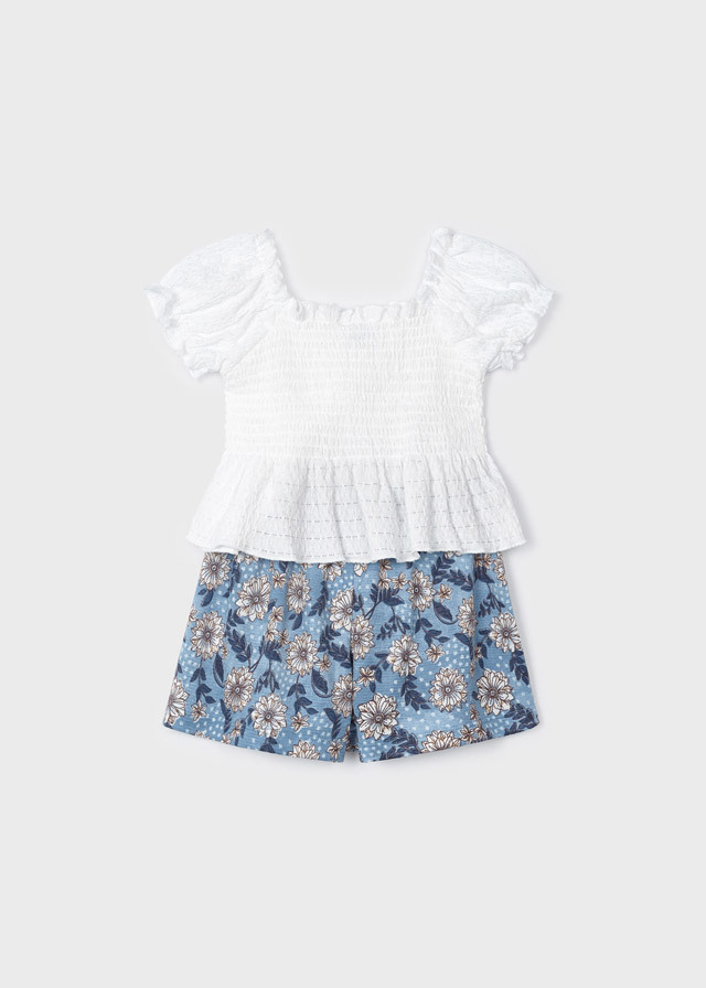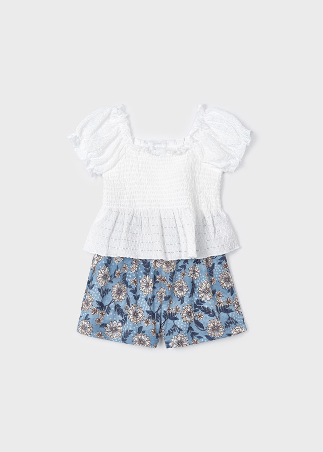 Фактурный топ молочного оттенкаи красивые голубые шортысоздадут отличный комплект длядевочки на лето.