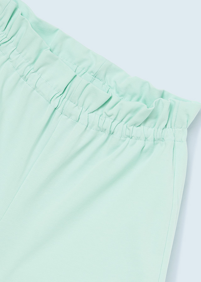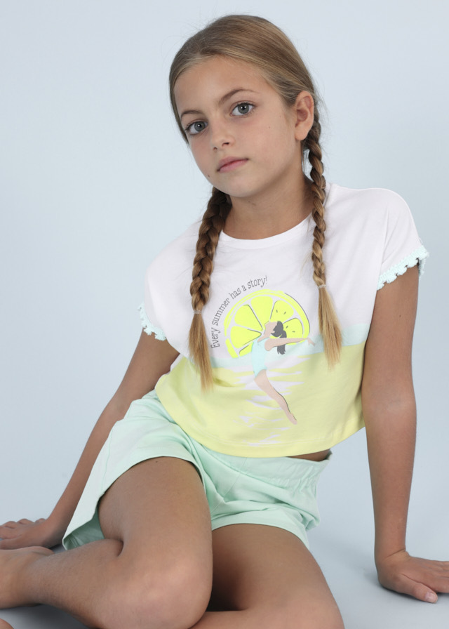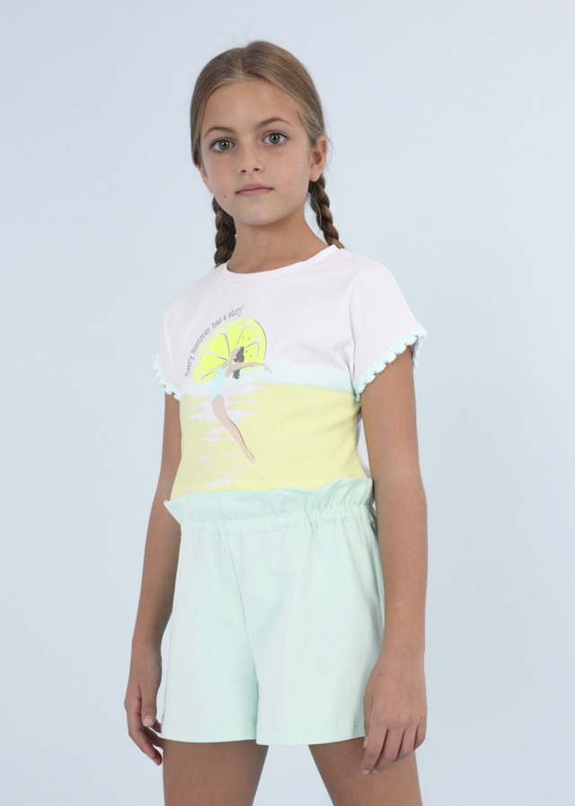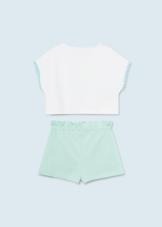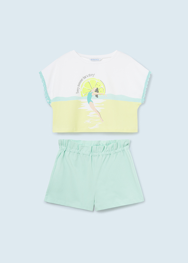 Милый светлый комплект избелоснежного топа с рисункомпляжа и шорт цвета тиффани будетстильно смотреться и с сандалями,и с кроссовками.