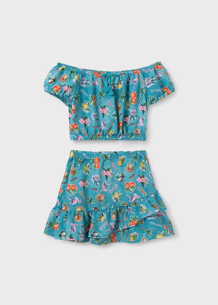Стильный летний костюм изярких топа и юбки с рисункомотлично будет смотреться дляпрогулок по городу. В сочетаниис белыми кроссовками образ будеточень стильным и современным.