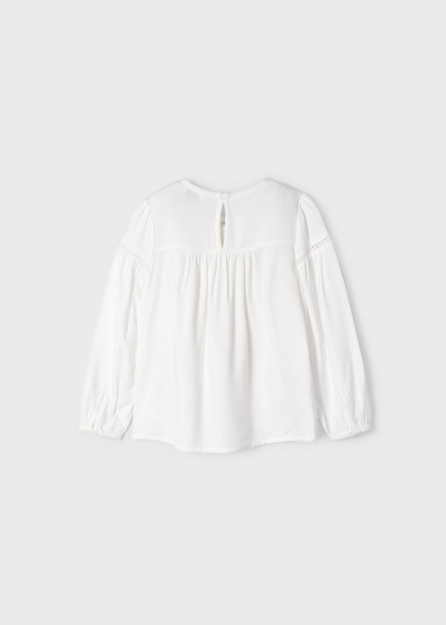 Белая воздушная туника с эффектомкружева на груди и декором на рукавахсделает наряд Вашей дочки легкими нежным. Прекрасно будет сочетатьсяне только с юбкой, но и с джинсами.