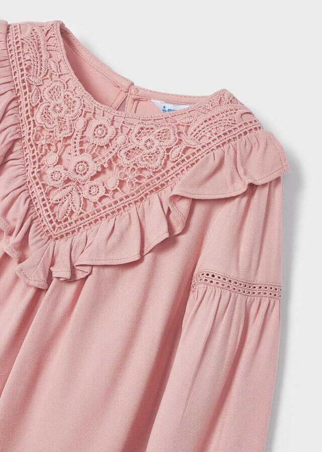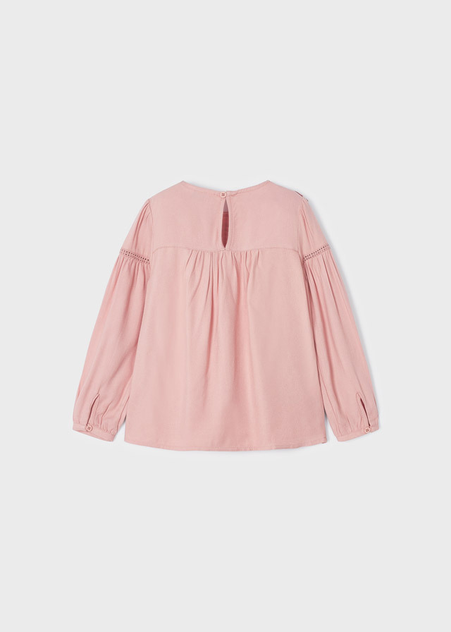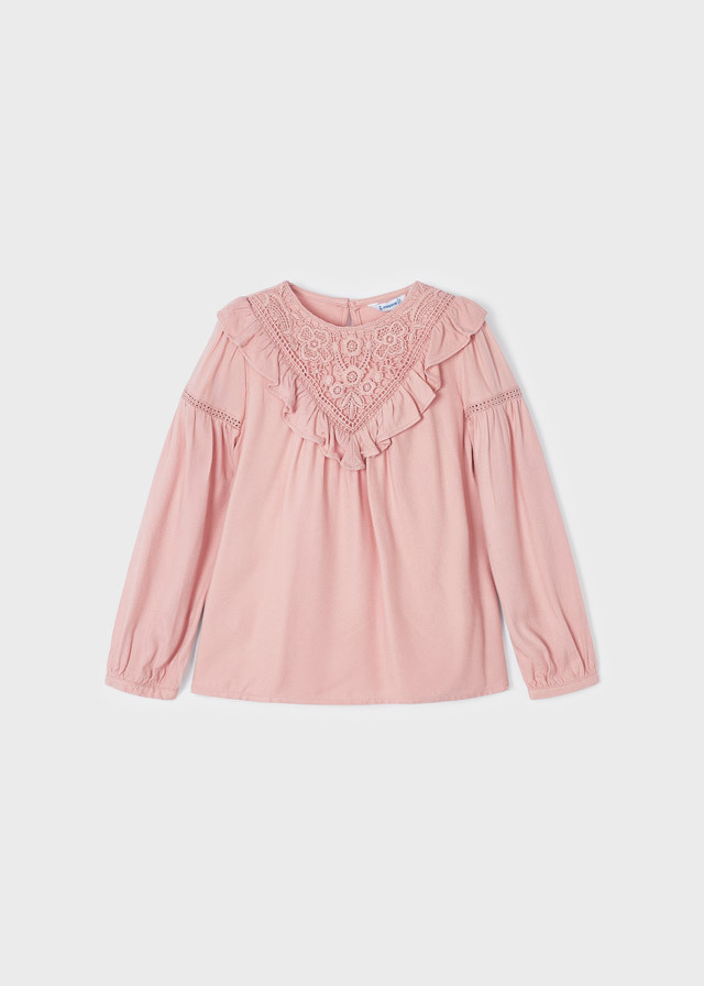Блузка цвета пыльной розы с эффектомкружева на груди и декором на рукавахсделает наряд Вашей дочки легкими нежным. Прекрасно будет сочетатьсяне только с юбкой, но и с джинсами.