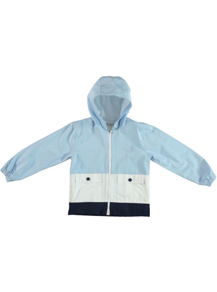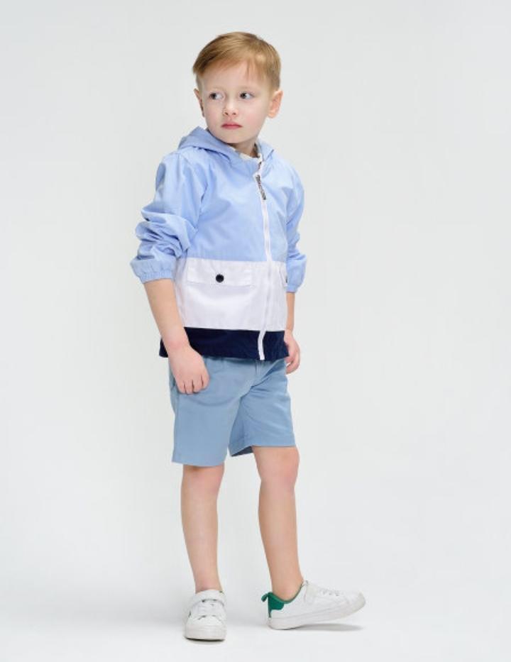 Трехцветная водонепроницаемаяветровка с капюшоном отличноподойдет для прогулок Вашемумаленькому непоседе. Подкладкакуртки выполнена из 100% хлопка.