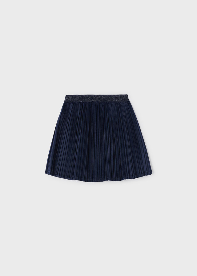 Плиссированная бархатная юбкаглубокого синего цвета с люрексомна поясе сделает образ Вашей дочкиособенным и самым элегантным.Она точно будет выделяться средиподружек.