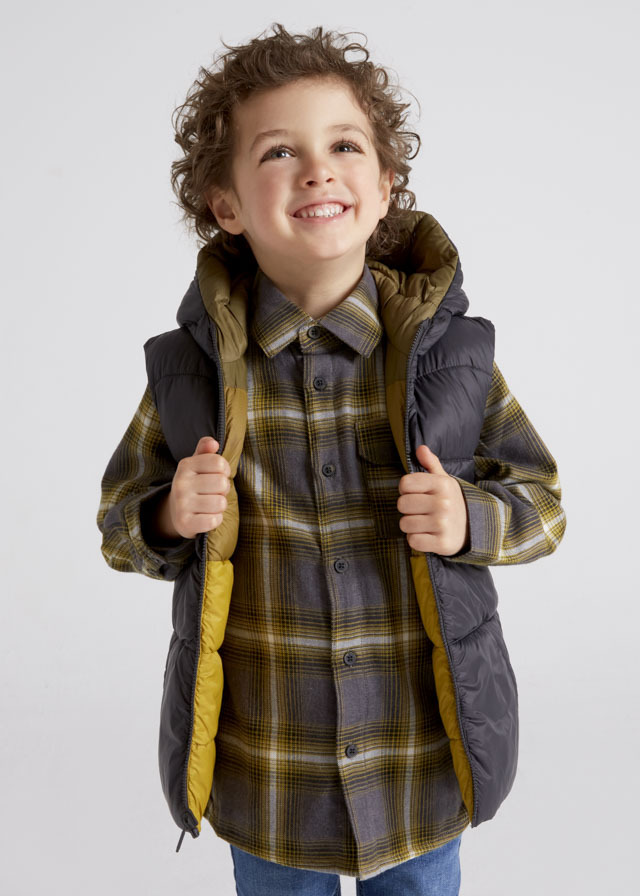 Двусторонняя жилетка яркогогорчичного цвета преобразитВашего мальчика этой осеньюи весной. С оборотной стороныжилет темно-серого цвета, чтопозволит ее сочетать абсолютно слюбыми брюками и джинсами.