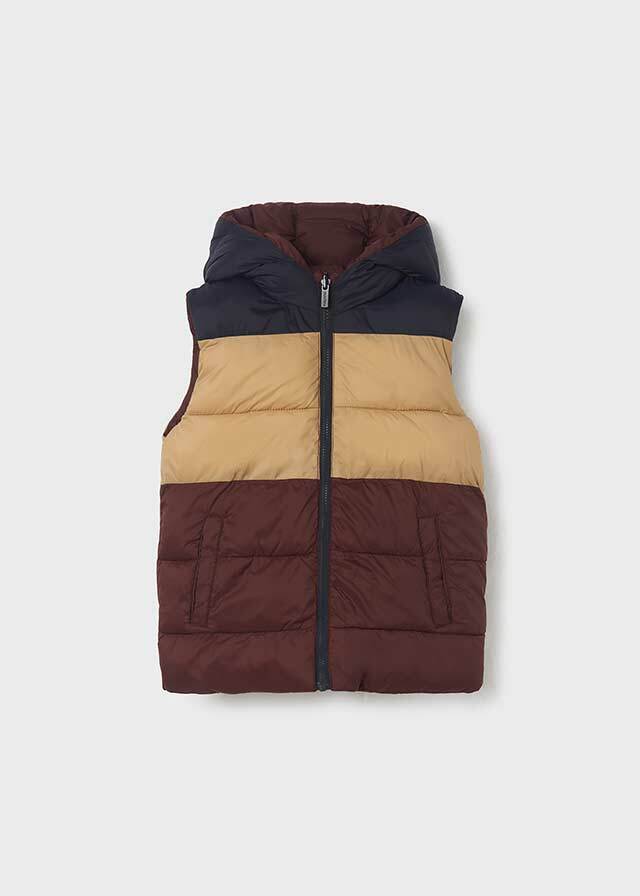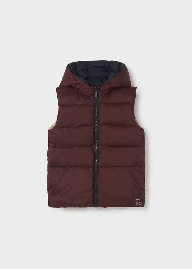 Двусторонняя жилетка благородногокоричневого цвета преобразитВашего мальчика этой осеньюи весной. С оборотной стороныжилет темно-серого цвета, чтопозволит ее сочетать абсолютно слюбыми брюками и джинсами.